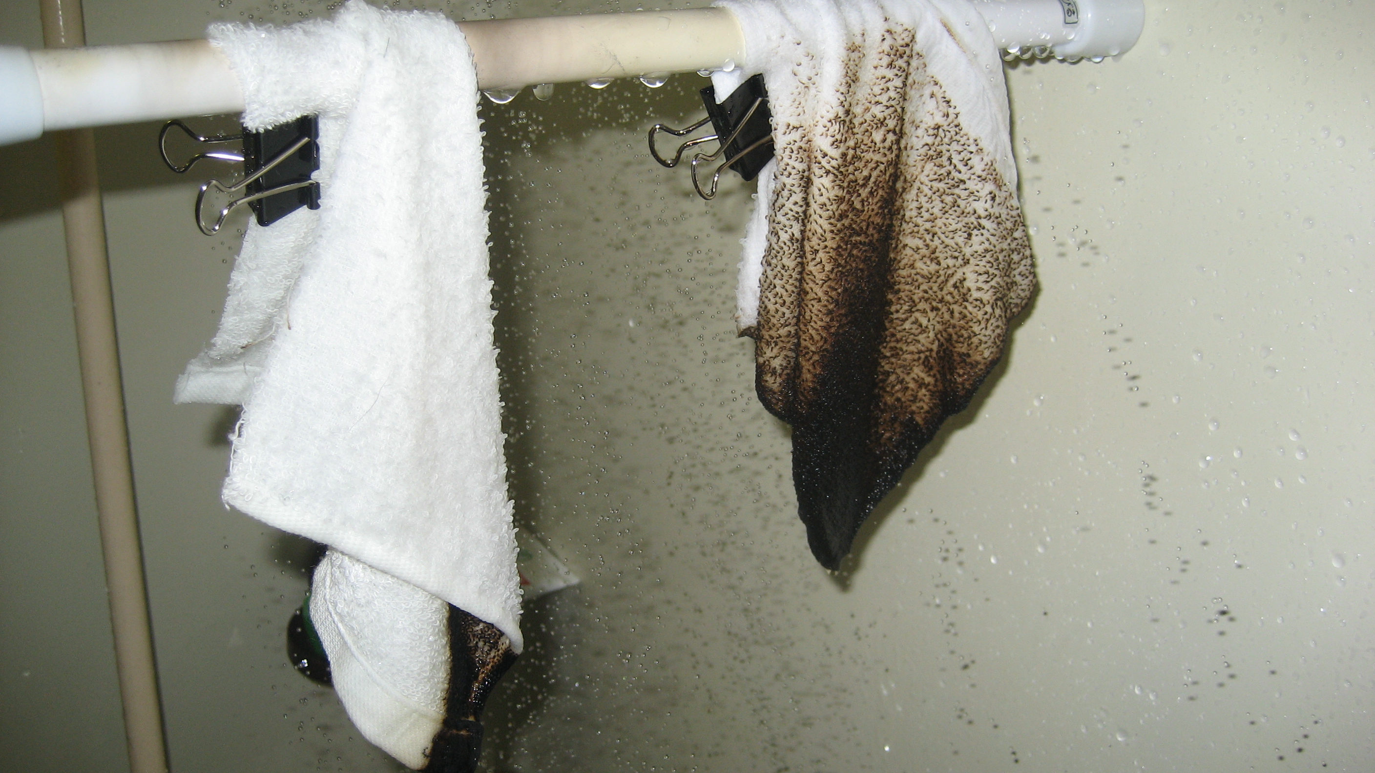 よくある「布お手ふき」に使われる商材に30秒発火…「E&S」噴霧(左側)無噴霧(右側)