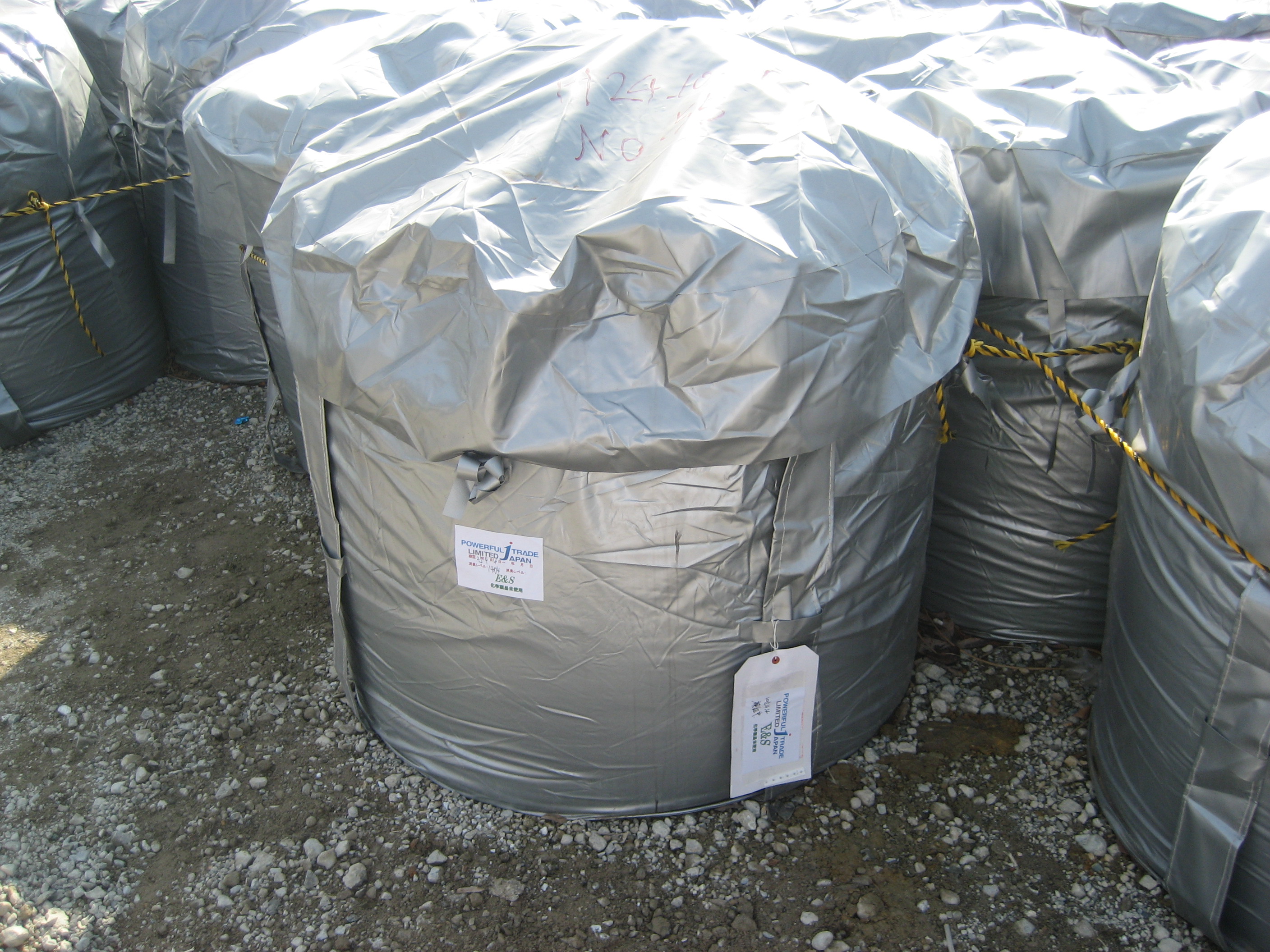 1袋1トンの「汚泥糞尿」が保管され、この中にはセシウム(原子力汚染物)も混入されているので処理できず、このような形で保管されている。